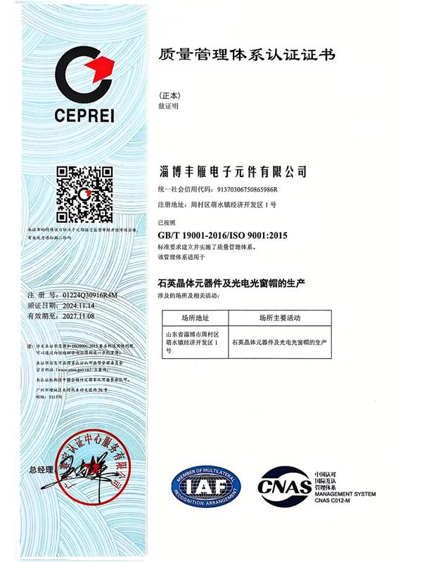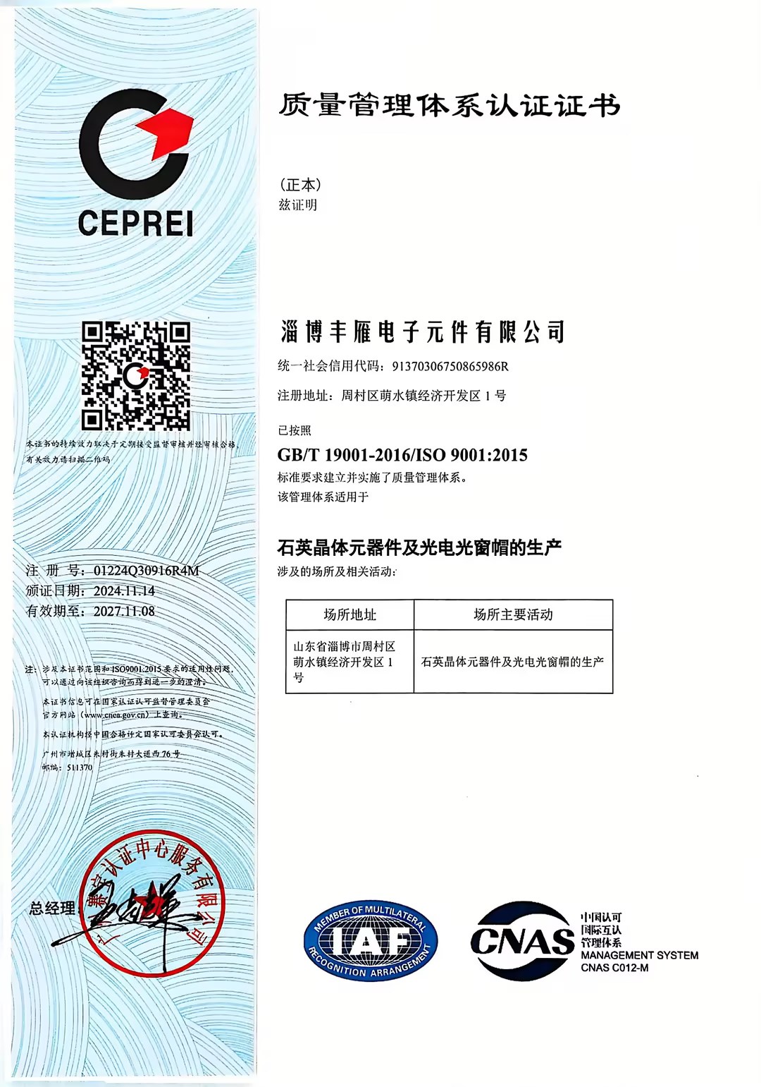 淄博豐雁電子元件有限公司,是一家集研發(fā)、生產(chǎn)、銷(xiāo)售為一體的透鏡管帽、晶體諧振器、晶體濾波器的高新技術(shù)企業(yè)。成立于1992年,坐落于山東省淄博市周村區(qū),注冊(cè)資金1000萬(wàn)元,擁有職工150余人,公司占地35000平方米,其中擁有5000平方的超凈化廠(chǎng)房,并配備了千級(jí)凈化工作臺(tái),確保環(huán)境的凈化度。公司下設(shè)光電事業(yè)部,濾波器事業(yè)部,晶體事業(yè)部等多個(gè)事業(yè)部。專(zhuān)注為光通訊、激光器領(lǐng)域以及各種電子應(yīng)用領(lǐng)域進(jìn)行電子元件配套。公司于1999年通過(guò)了ISO9000質(zhì)量體系認(rèn)證,公司提供的所有產(chǎn)品符合歐盟的R0HS和REACH標(biāo)準(zhǔn)。公司被認(rèn)定為淄博市“專(zhuān)精特新”企業(yè)、“淄博市企業(yè)技術(shù)中心”、省級(jí)“專(zhuān)精特新”企業(yè)、“山東省制造業(yè)單項(xiàng)冠軍”。公司擁有持續(xù)創(chuàng)新的研發(fā)團(tuán)隊(duì),有常年的外聘技術(shù)專(zhuān)家長(zhǎng)期指導(dǎo),并且與國(guó)內(nèi)多所大學(xué)和光電研究所保持長(zhǎng)期合作關(guān)系,確保了產(chǎn)品和技術(shù)的先進(jìn)性,能持續(xù)為客戶(hù)提供高質(zhì)量的產(chǎn)品和更好的全方位服務(wù)。